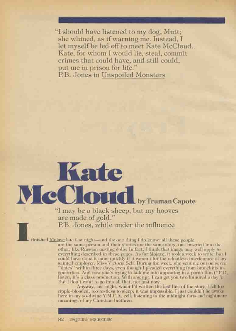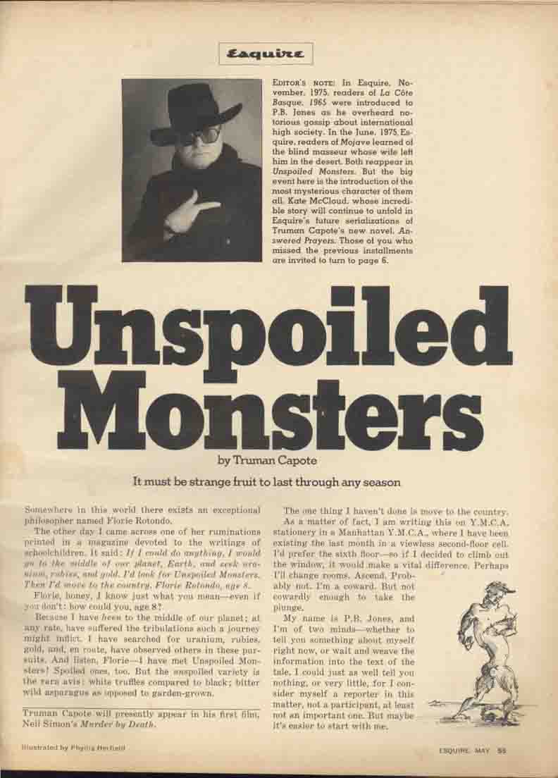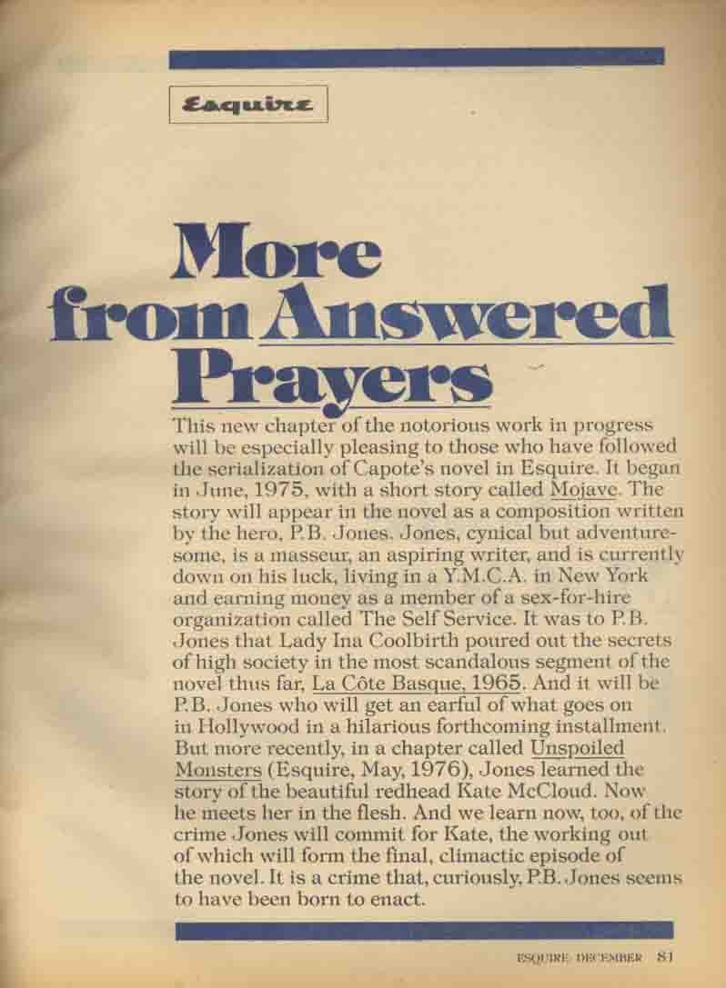 1987年に「Auswered Prayer」も刊行されます。この「Auswered Prayer」には「Unspoiled Monster」1976年5月発表/「KateMcCloud」1976年12月発表/「La Cote Basque」1975年11月発表の3作が収録されてます。ともに「ESQUIRE」掲載のものです。当時、「ESQUIRE」誌ではカポーティの予告したノンフィクション大作「Auswered Prayer」により発行部数増加をもくろみ購読者拡張のキャンペーンを張りました。
