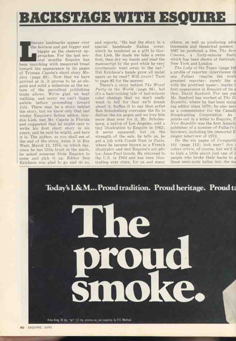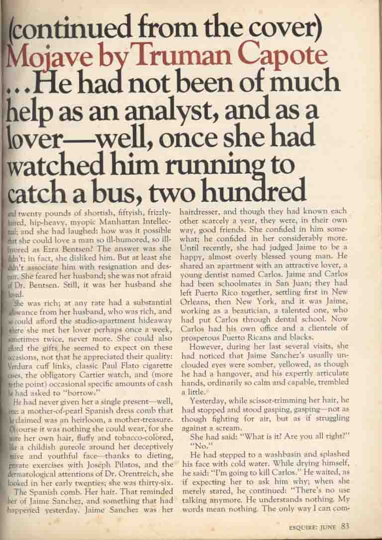 1983年6月「ESQUIRE」に表紙より文章掲載されたCAPOTEの「Majave」ですがノンフィクション作品集「Music for Cameleons」1890年刊に収録されました(「カメレオンのための音楽」早川書房・野坂昭如訳あります)。盲目の旦那をモハベ砂漠に置去りにするノンフィクションです。