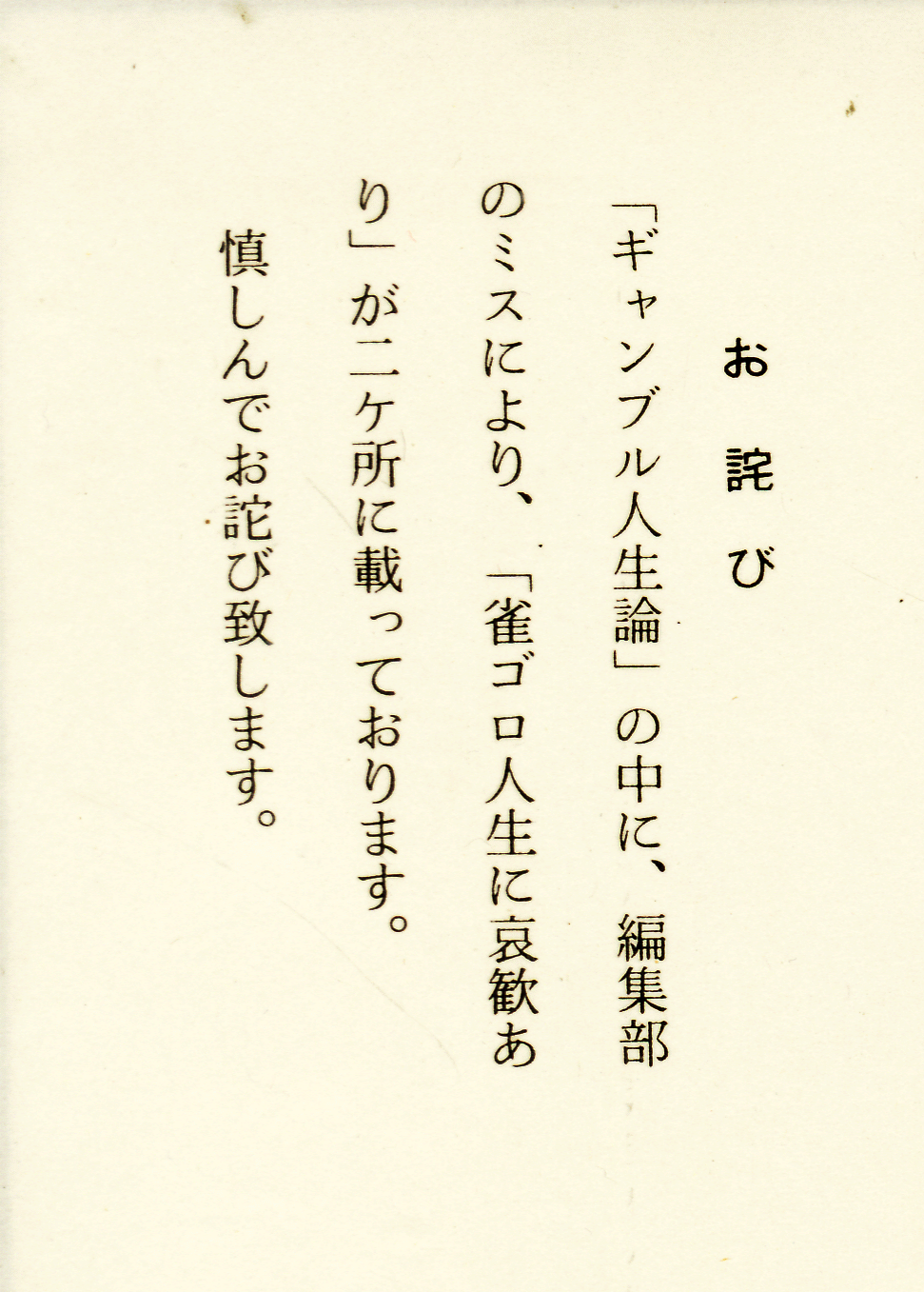 「編集部のミスにより『雀ゴロ人生に哀歓あり』が2ヶ所に載っております。」ということです。こちらは特に作業の手間はありません。確認してみますと、2ケ所の収録には、同文なのに若干異なる改行がしてあり、さらに不自然なあり様でした。