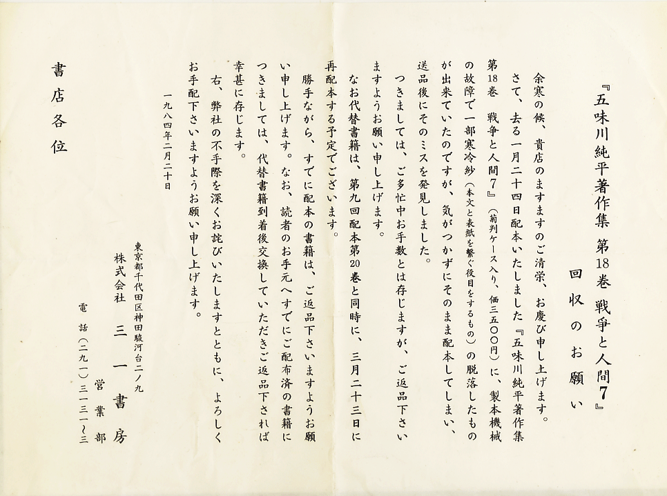 「五味川純平著作集」三一書房(1984年)には、二つ折の一文が挟まっておりました。「製本機械の故障にて生じた不良の製本『第18巻』の回収」の知らせです。こちらはリコールでした。