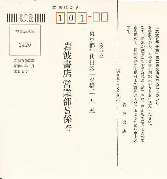本のリコールとは その6 『志賀直哉全集』と交換の申込み葉書